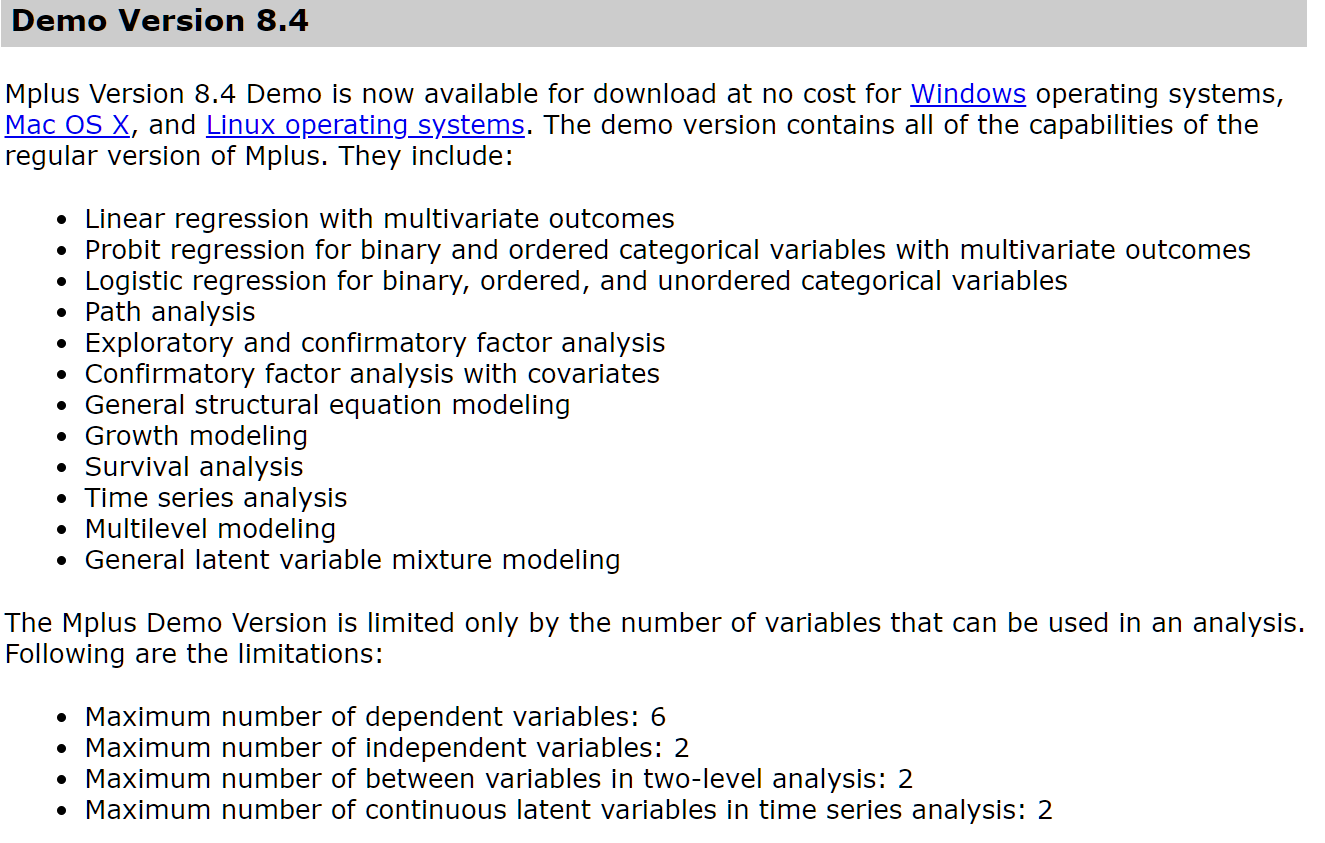 Mplus Version 8.4 Demo is now available for download at no cost for Windows operating systems, Mac OS X, and Linux operating systems. The demo version contains all of the capabilities of the regular version of Mplus. They include: Linear regression with mu