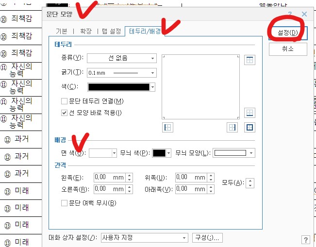 문단모양 > 테두리/배경 > 배경 면색 흰색으로 다시 클릭 > 설정