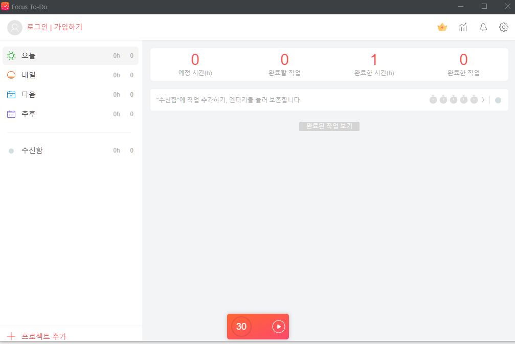 클릭하고 열면 처음 보이는 화면은 아래와 같고, 할일 프로젝트도 설정하고 그 프로젝트당 뽀모도로 몇번 돌았는 지 볼 수 있어요. 프로젝트를 설정하지 않으면 뽀모도로가 다 합산된다는 것이 단점이에요. (예로 어제 한 뽀모도로와 오늘 한 뽀모도로 횟수가 합쳐짐)