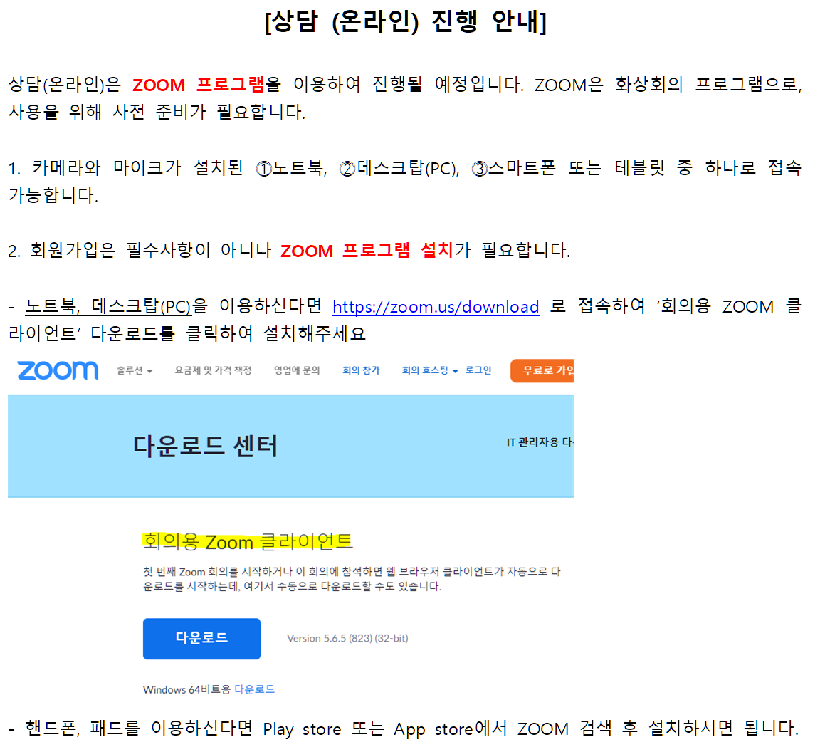 안녕하세요 꿍꾸룽입니다. 코노라19로 인해 언텍트 시대가 열리고, 대면이 기본이던 상담도 비대면 방식으로 많이 이루어지고 있어요. 정부에서 추천한 zoom 프로그램을 상담에 활용하면서, 상담