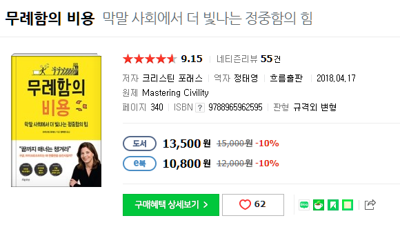 그래서 찾게 된 책도 무례함의 비용. 책을 선정할 때 나의 관심사를 따르기 마련인데, 여행을 한참 다닐 땐 여행에 관련된 책 들이었고, 어떤 시기엔 정신병리에, 어떤 시기엔 오랜 학교 생활에, 또는 직장인에 퇴사에 등, ㅎㅎ 어떤 시기에 뭘 빌렸는 지 통계로 볼 수 있으면 그것도 재밌겠다.