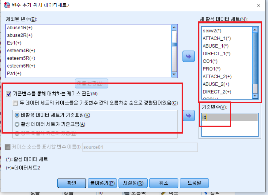 저는 ID가 같은 사람들의 변수 (차시에 따라 다르게 답한 것들)를 추가 하는 거라서 변수 추가를 클릭했어요.