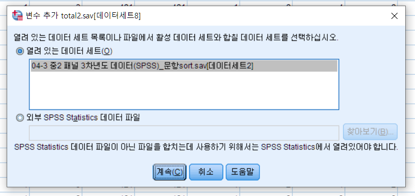 저는 그런 과정에서 제가 실수할 거 같아서 (나 자신을 믿지않아 ~~) SPSS 파일 MERGE 기능을 활용했어요.