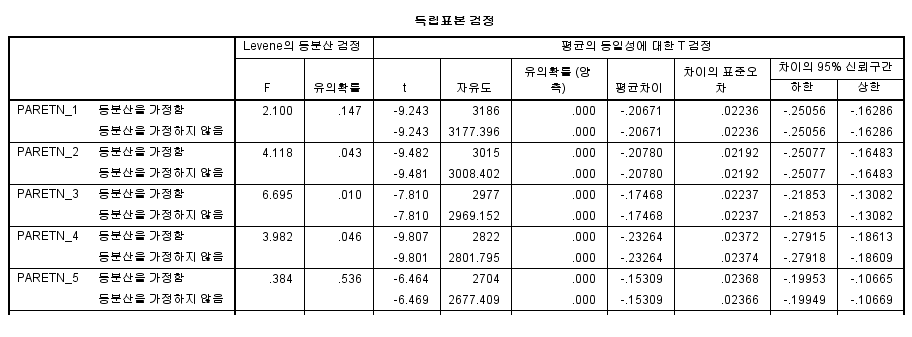 제가 캡쳐한 자료를 보면, PARETN_1, 5는 등분산을 가정한 값으로보고, 나머지는 등부산을 가정하지 않은 값으로 보아야 겠네요!