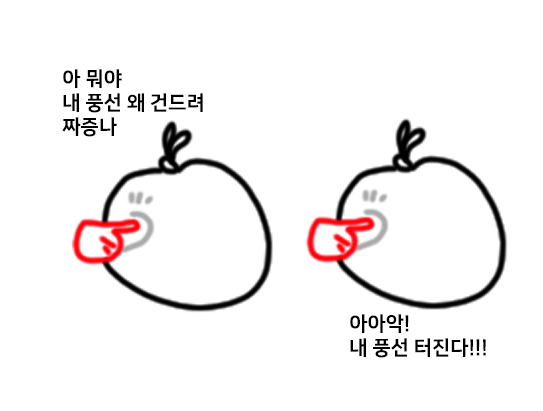ㅋㅋㅋㅋㅋㅋㅋ그림이.. (ㅋㅋㅋ) 풍선에 비유한건데, 빨간 게 손이고 스트레스원 (스트레스의 원인)입니다. 손가락이 풍선을 눌렀을 때 움푹 들어가잖아요. 움푹 들어가는 정도는 왼쪽 풍선과 오른쪽 풍선 둘 다 같은 데 각 각 풍선의 주인이 느끼는 바가 다릅니다. 글로 적어놓은 게 주인의 심정이에요.